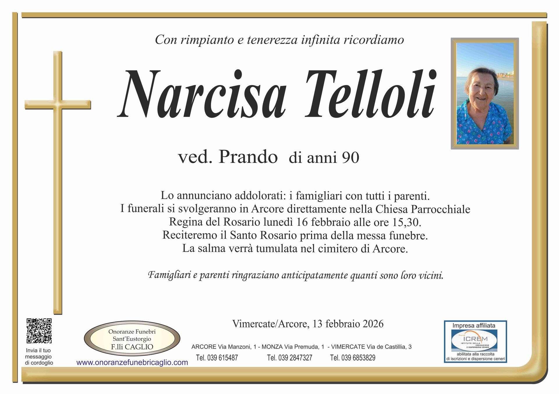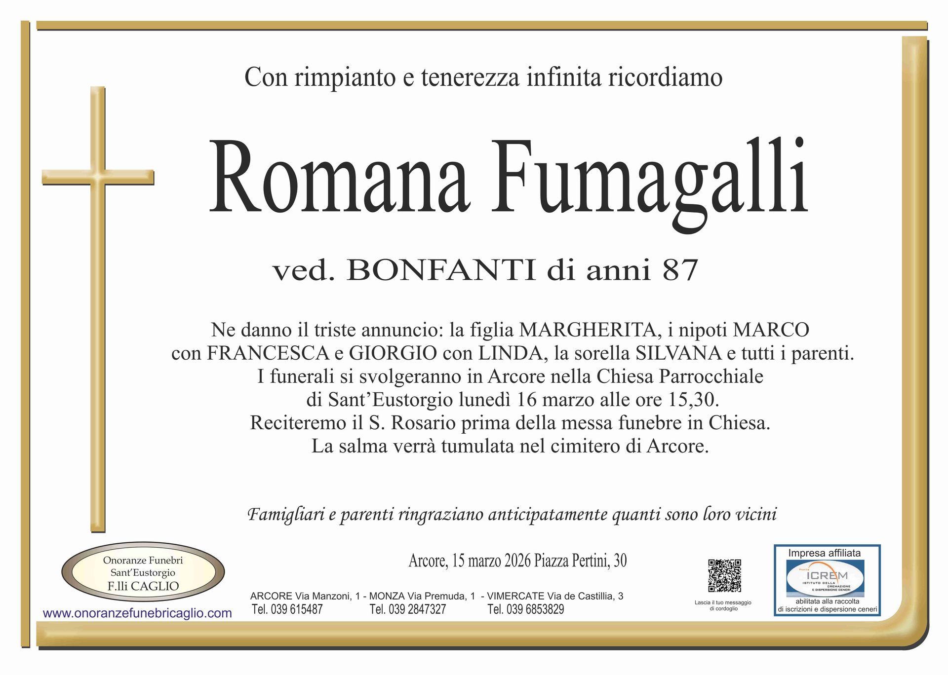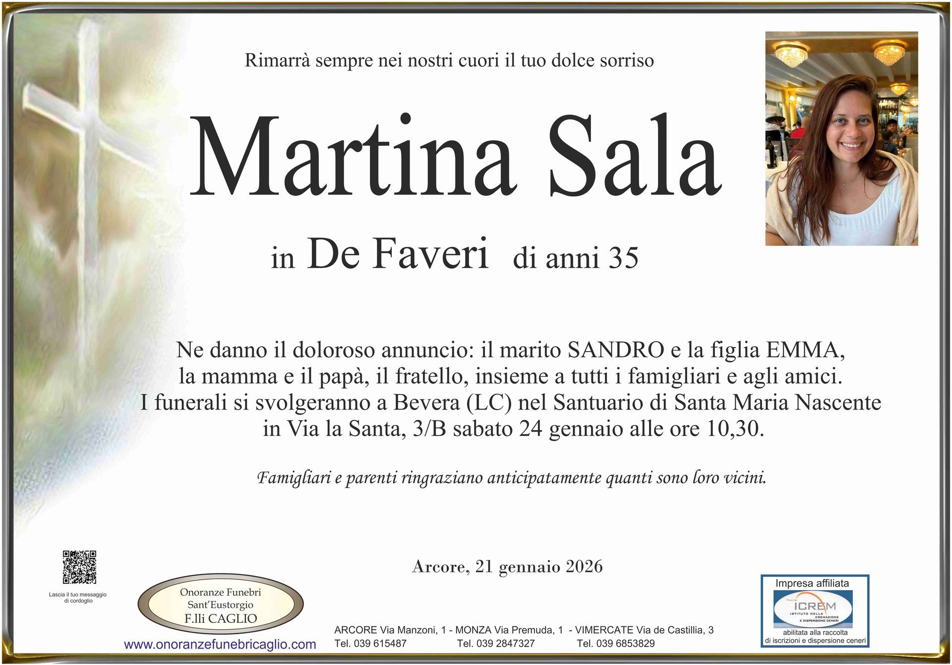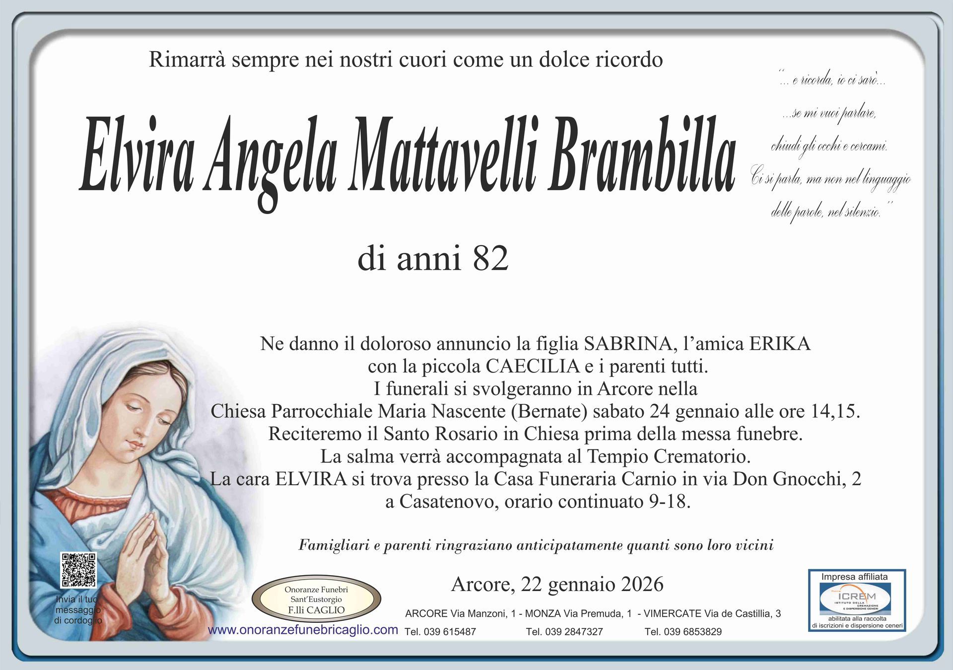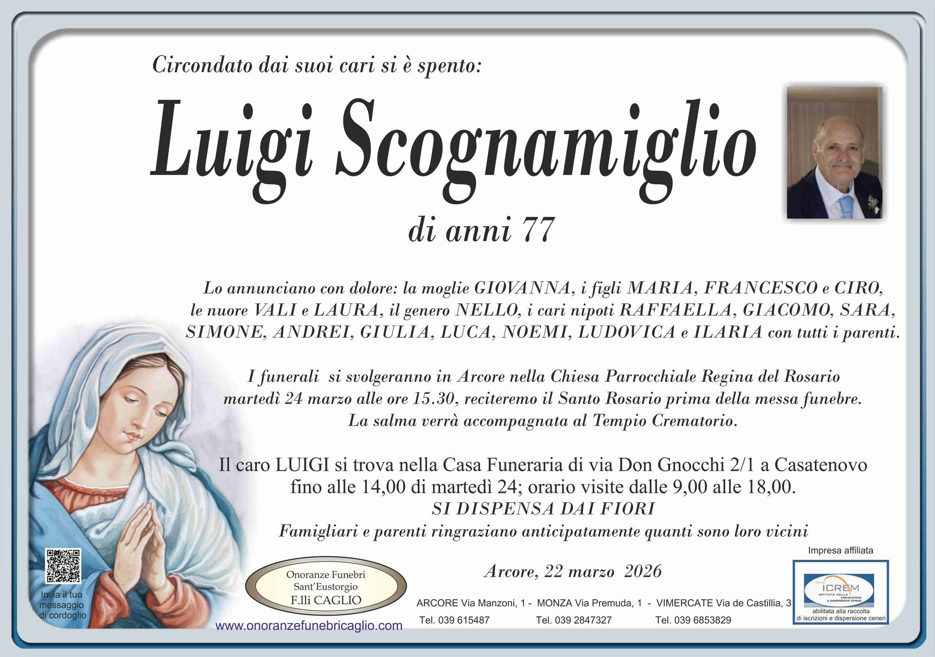 Nel doloroso momento del lutto riconosciamo quanto sia importante poter offrire un conforto, anche quando non è possibile essere fisicamente presenti. Per questo motivo, abbiamo implementato in questa sezione dedicata agli annunci funebri la possibilità di inviare un messaggio di condoglianze alla famiglia del defunto tramite il nostro sito.