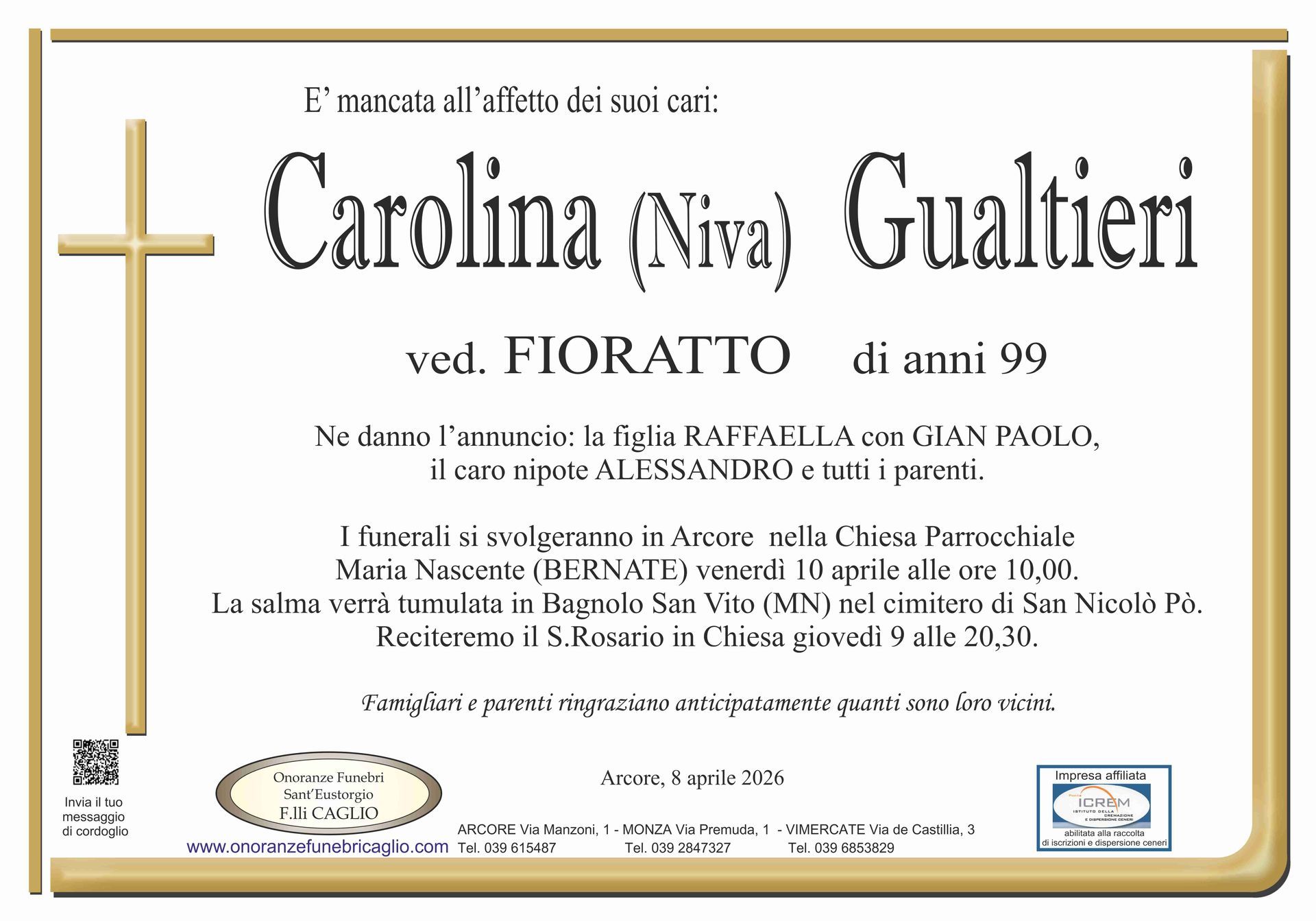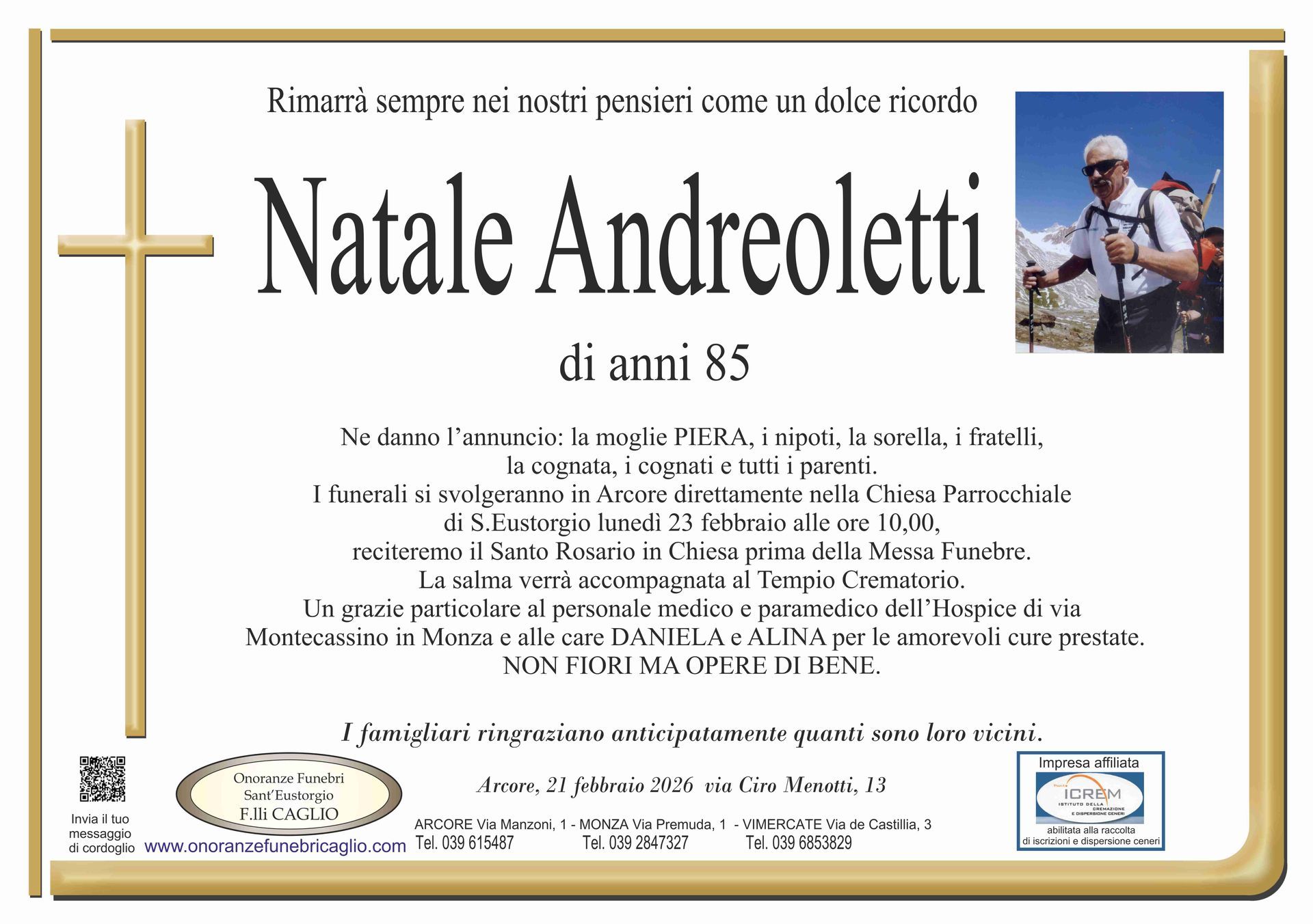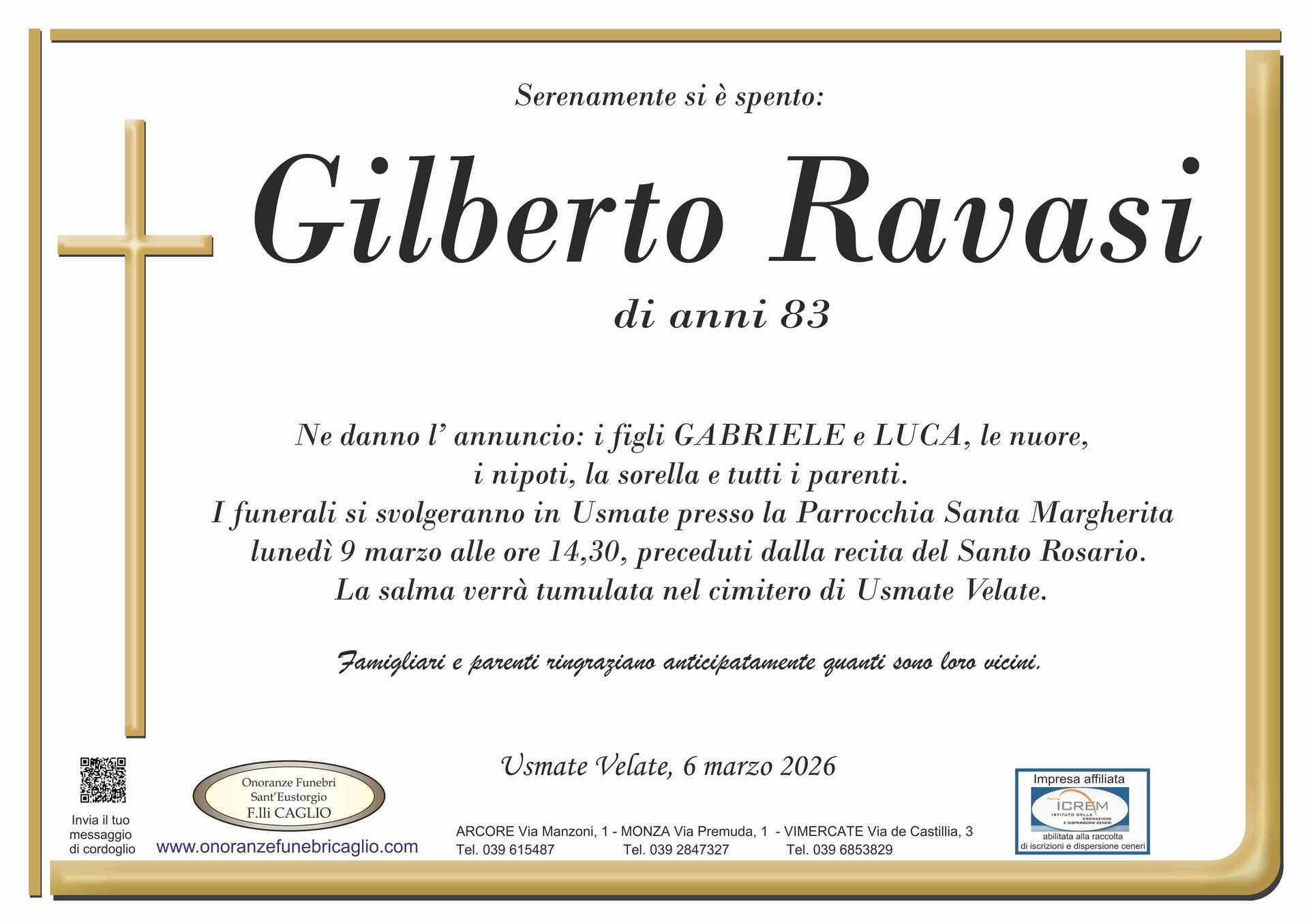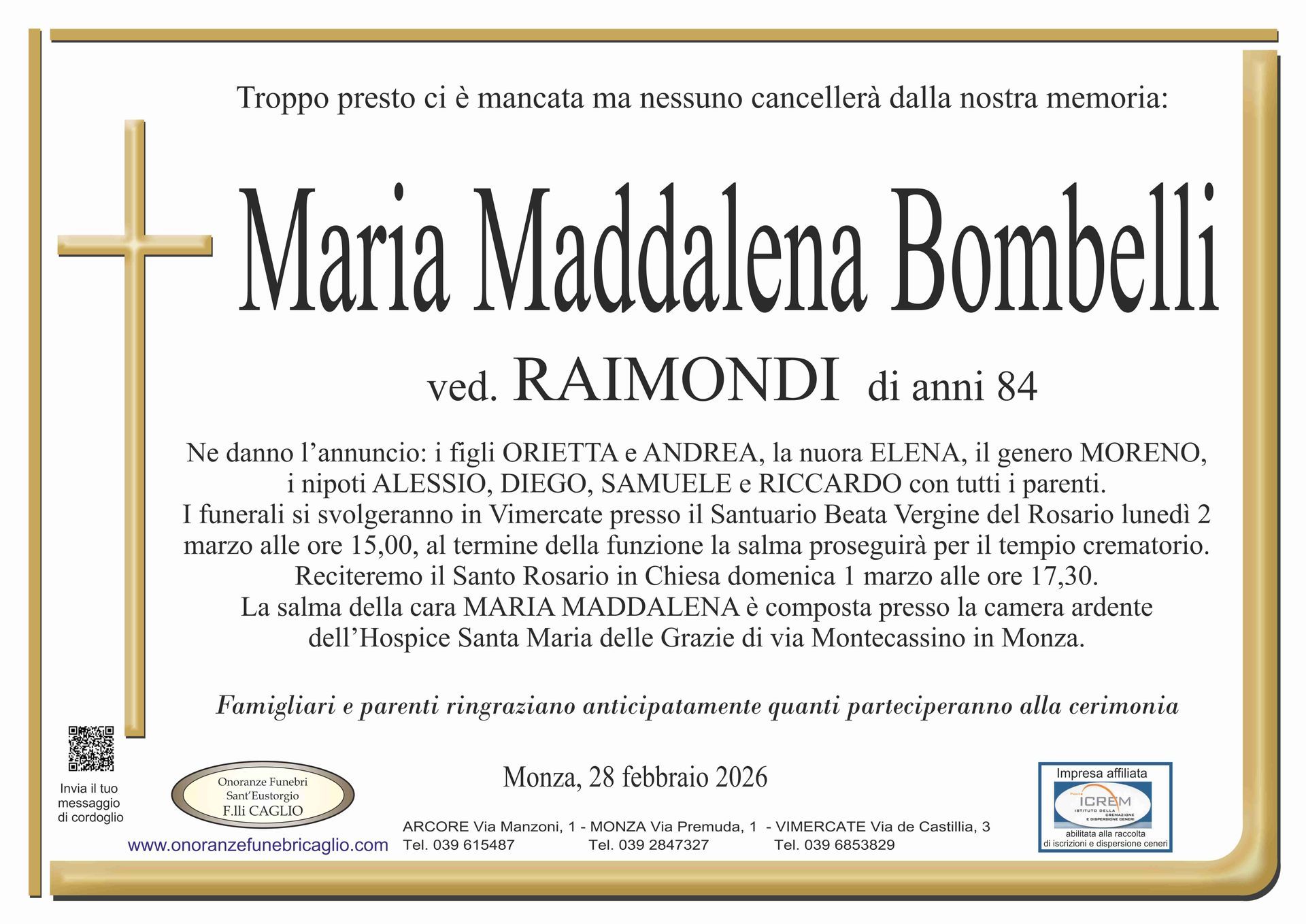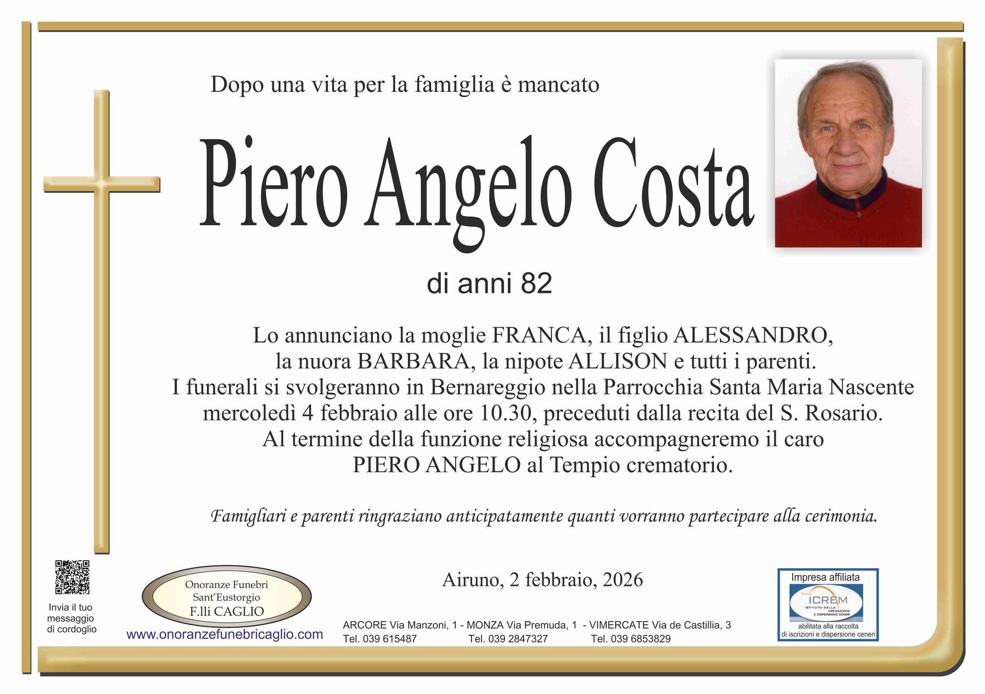 Nel doloroso momento del lutto riconosciamo quanto sia importante poter offrire un conforto, anche quando non è possibile essere fisicamente presenti. Per questo motivo, abbiamo implementato in questa sezione dedicata agli annunci funebri la possibilità di inviare un messaggio di condoglianze alla famiglia del defunto tramite il nostro sito.