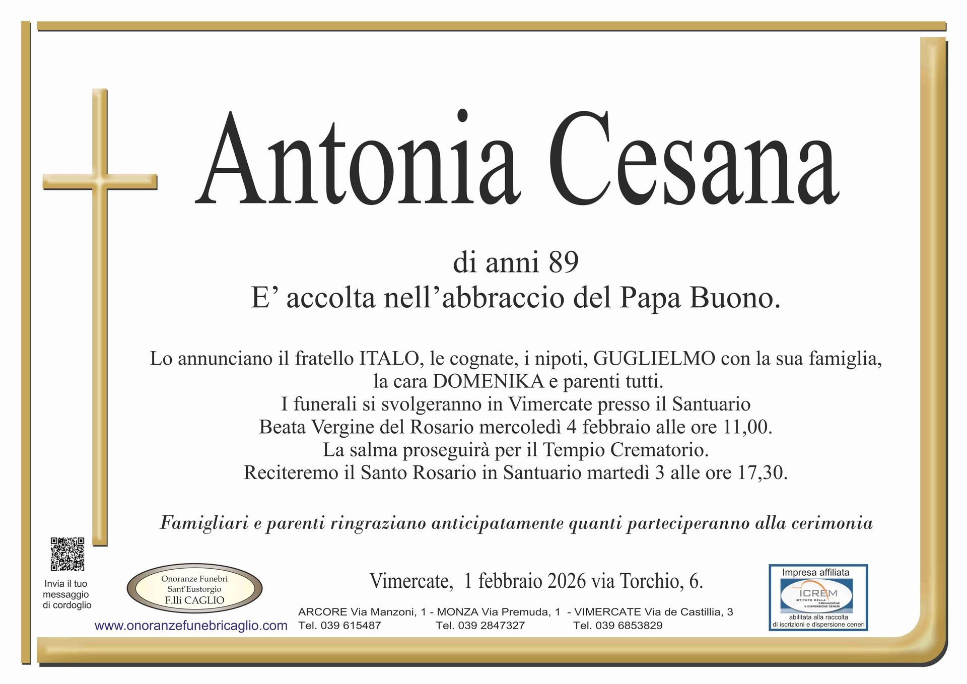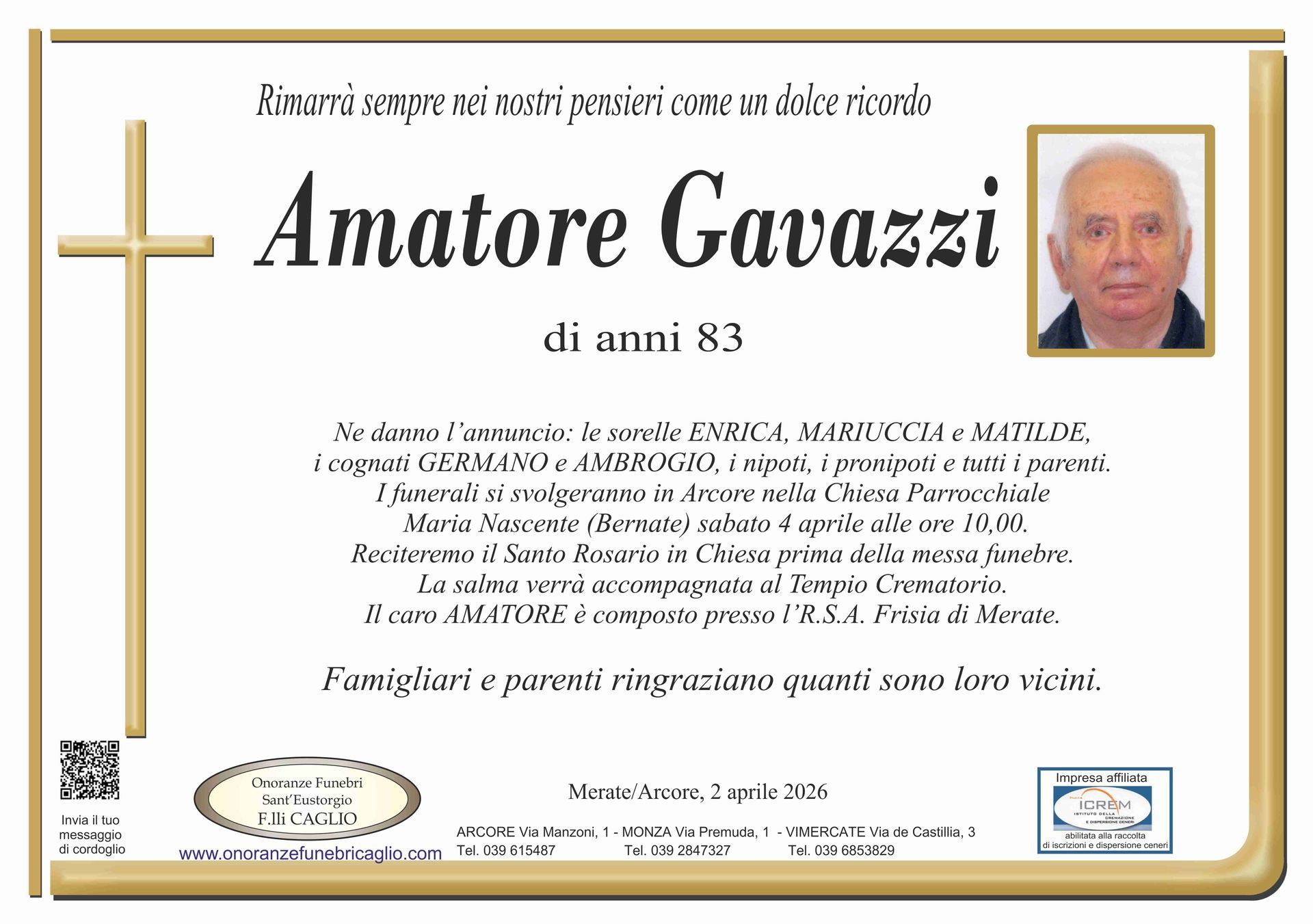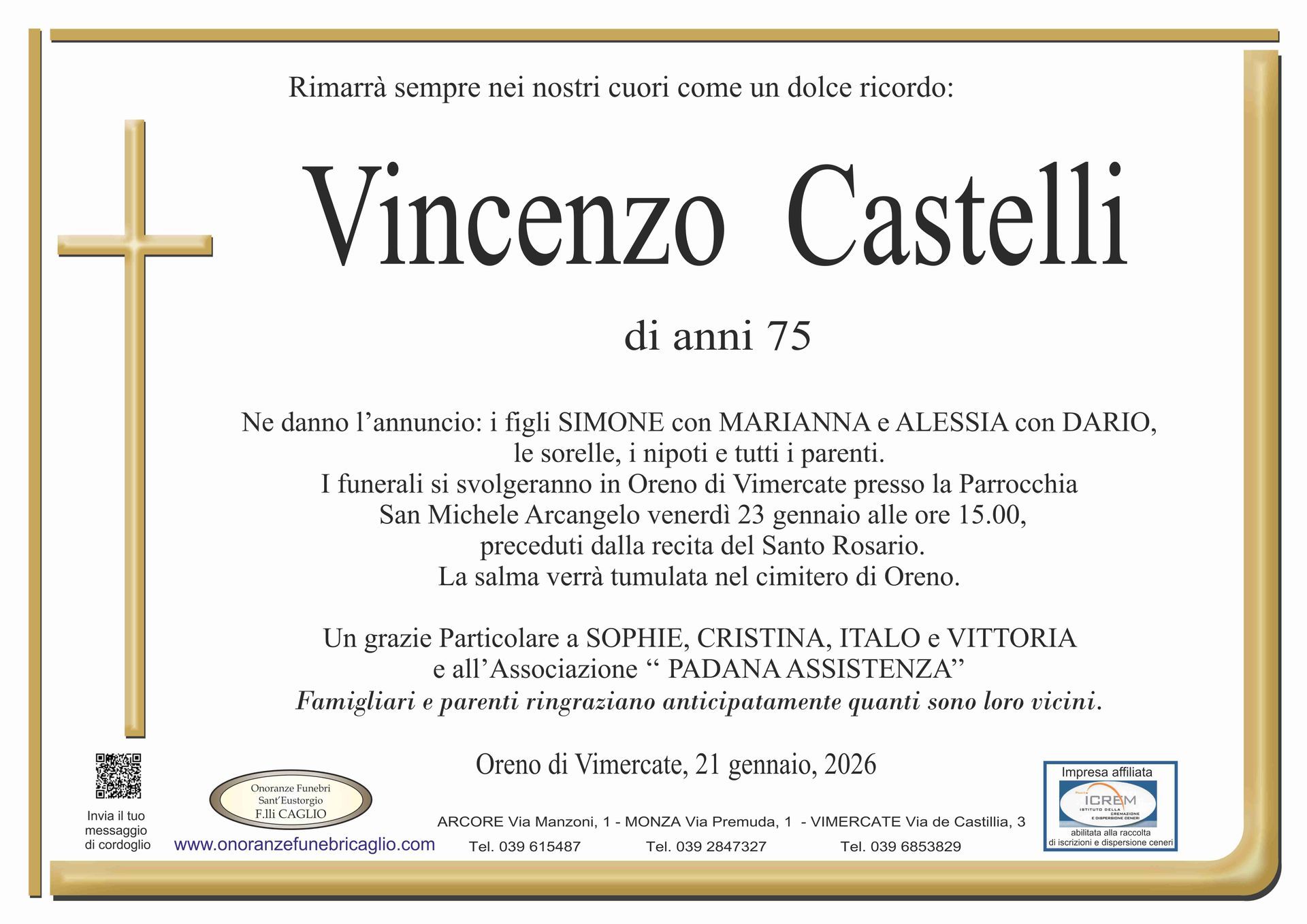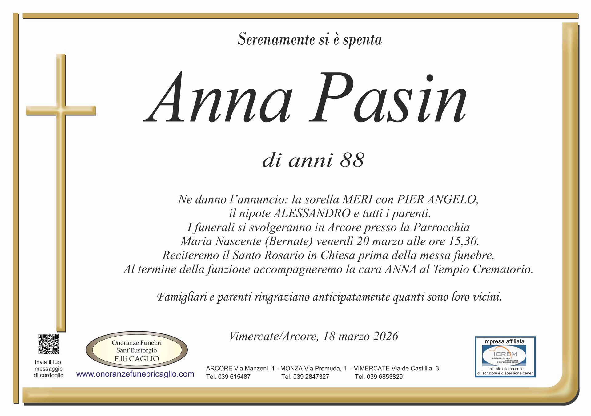 Nel doloroso momento del lutto riconosciamo quanto sia importante poter offrire un conforto, anche quando non è possibile essere fisicamente presenti. Per questo motivo, abbiamo implementato in questa sezione dedicata agli annunci funebri la possibilità di inviare un messaggio di condoglianze alla famiglia del defunto tramite il nostro sito.