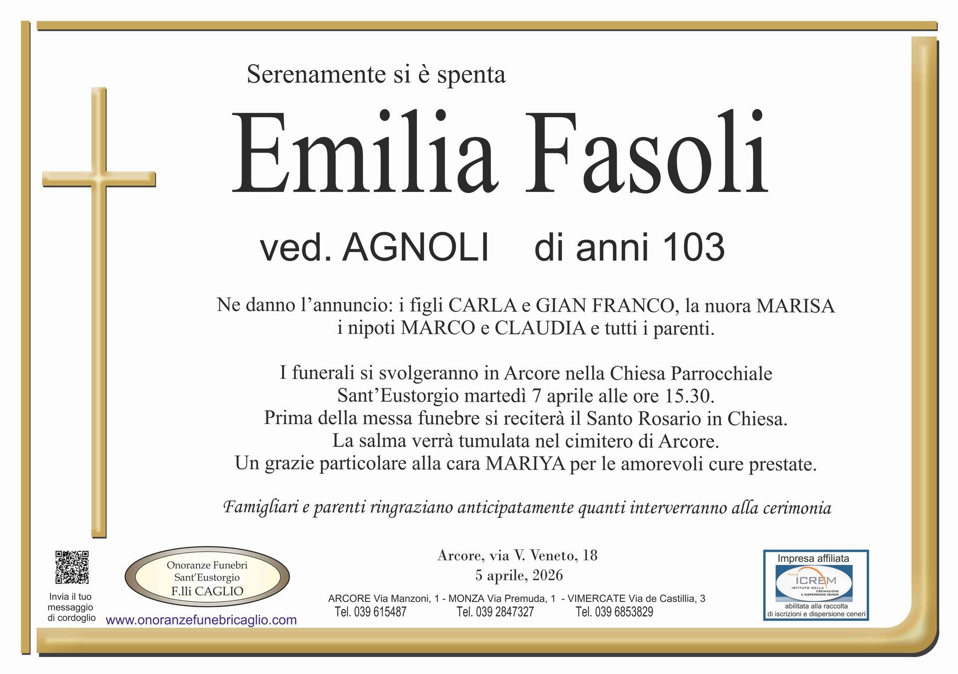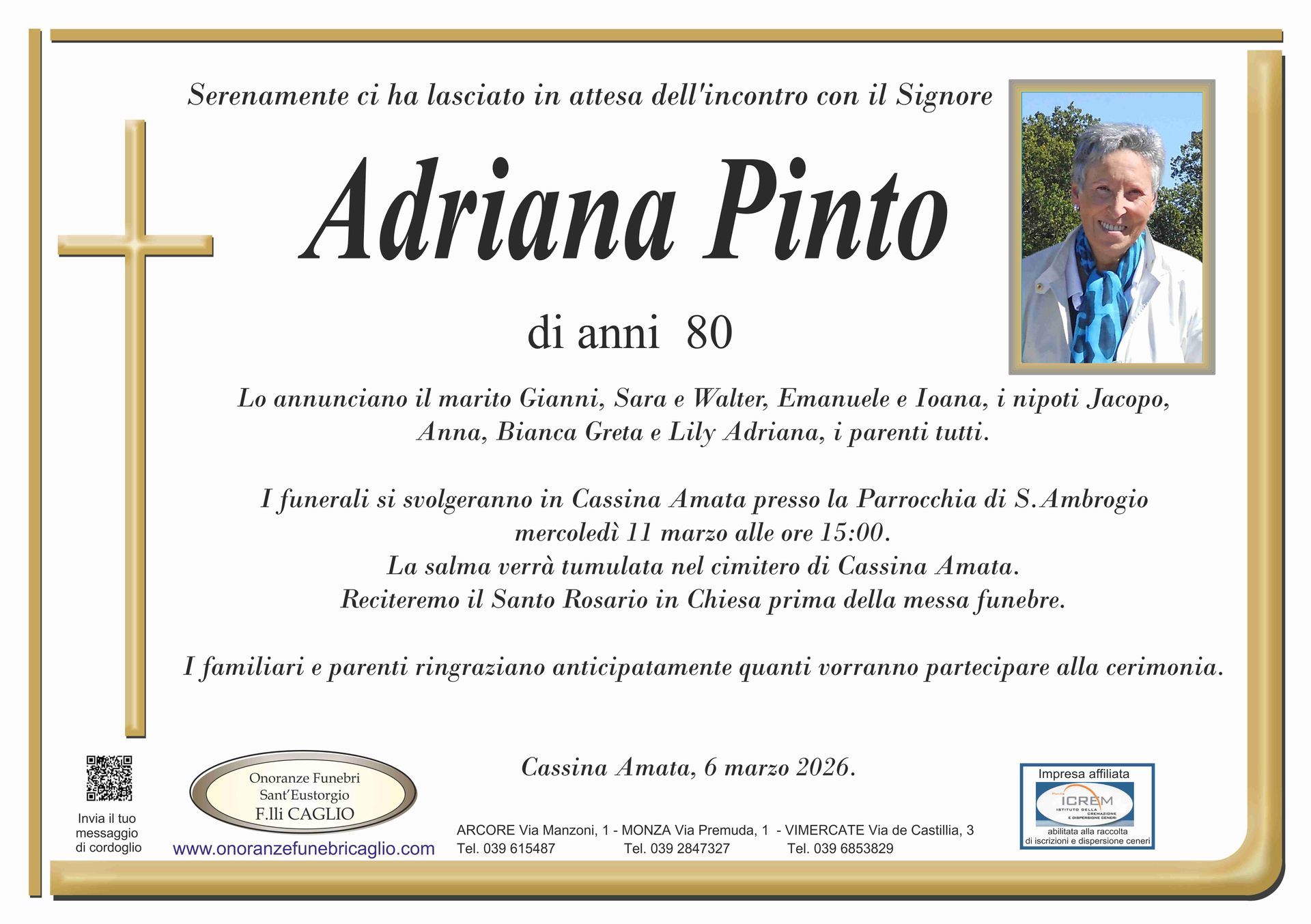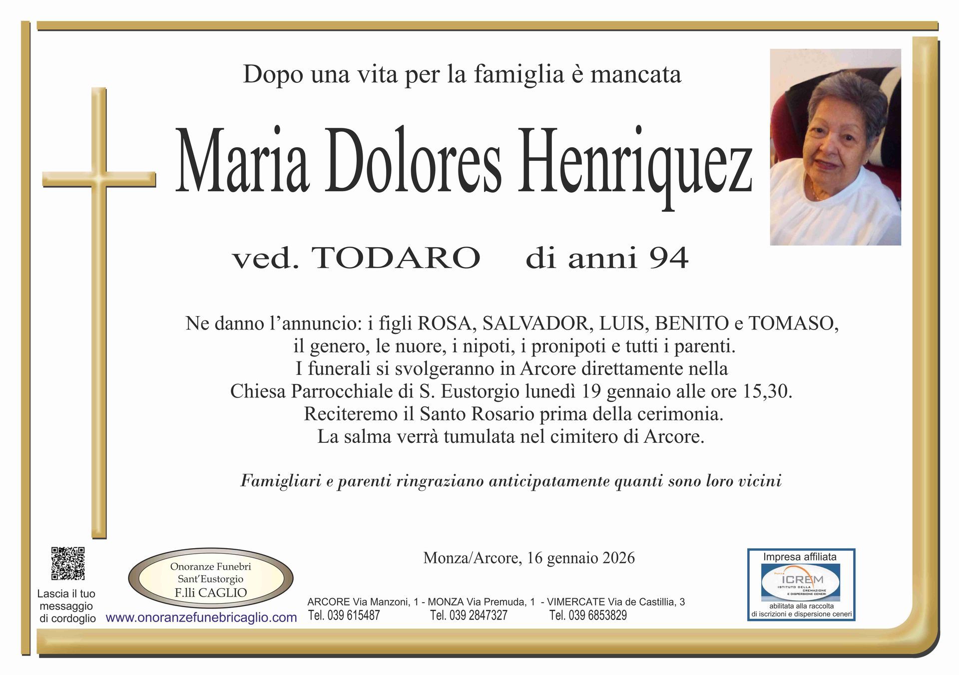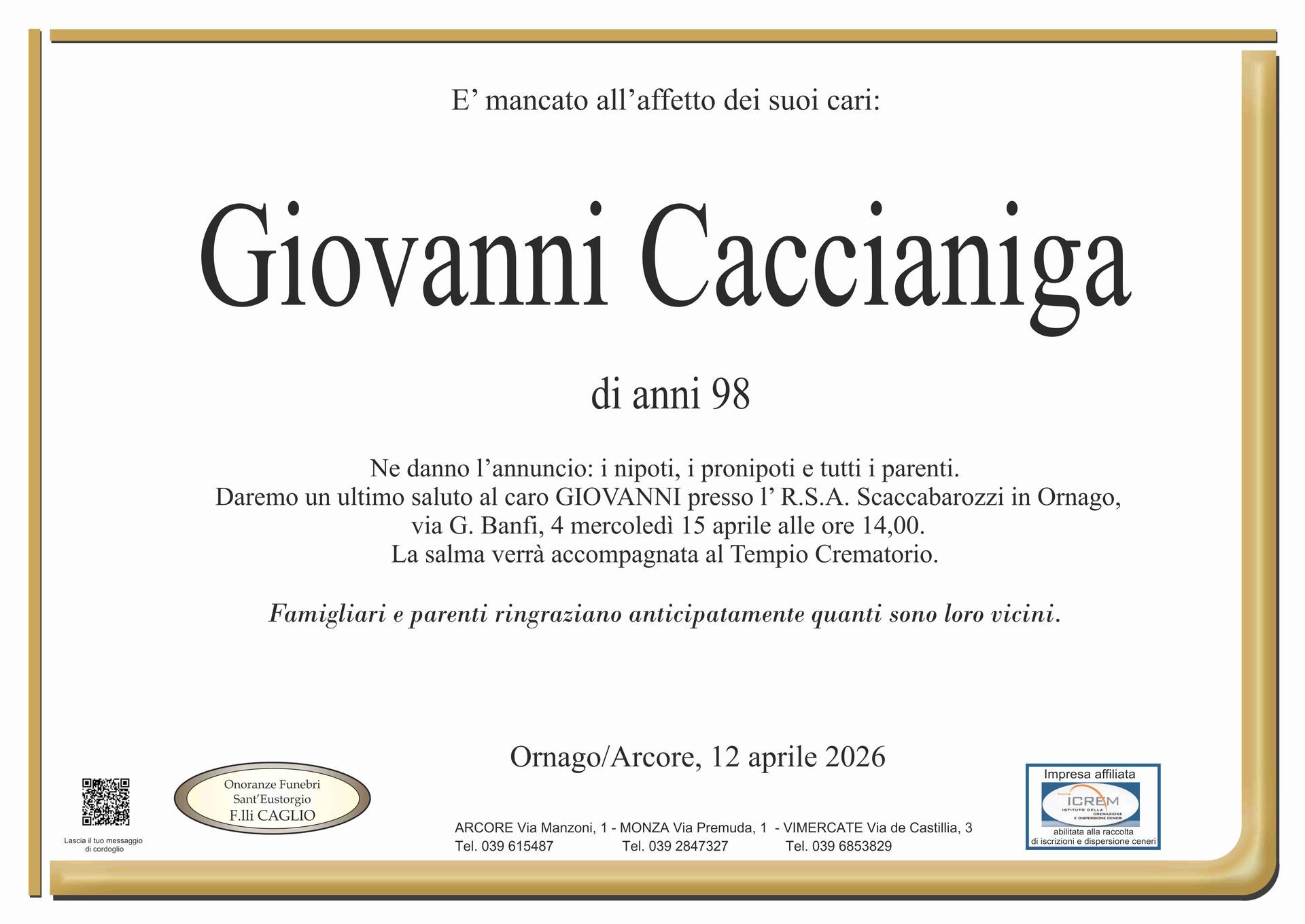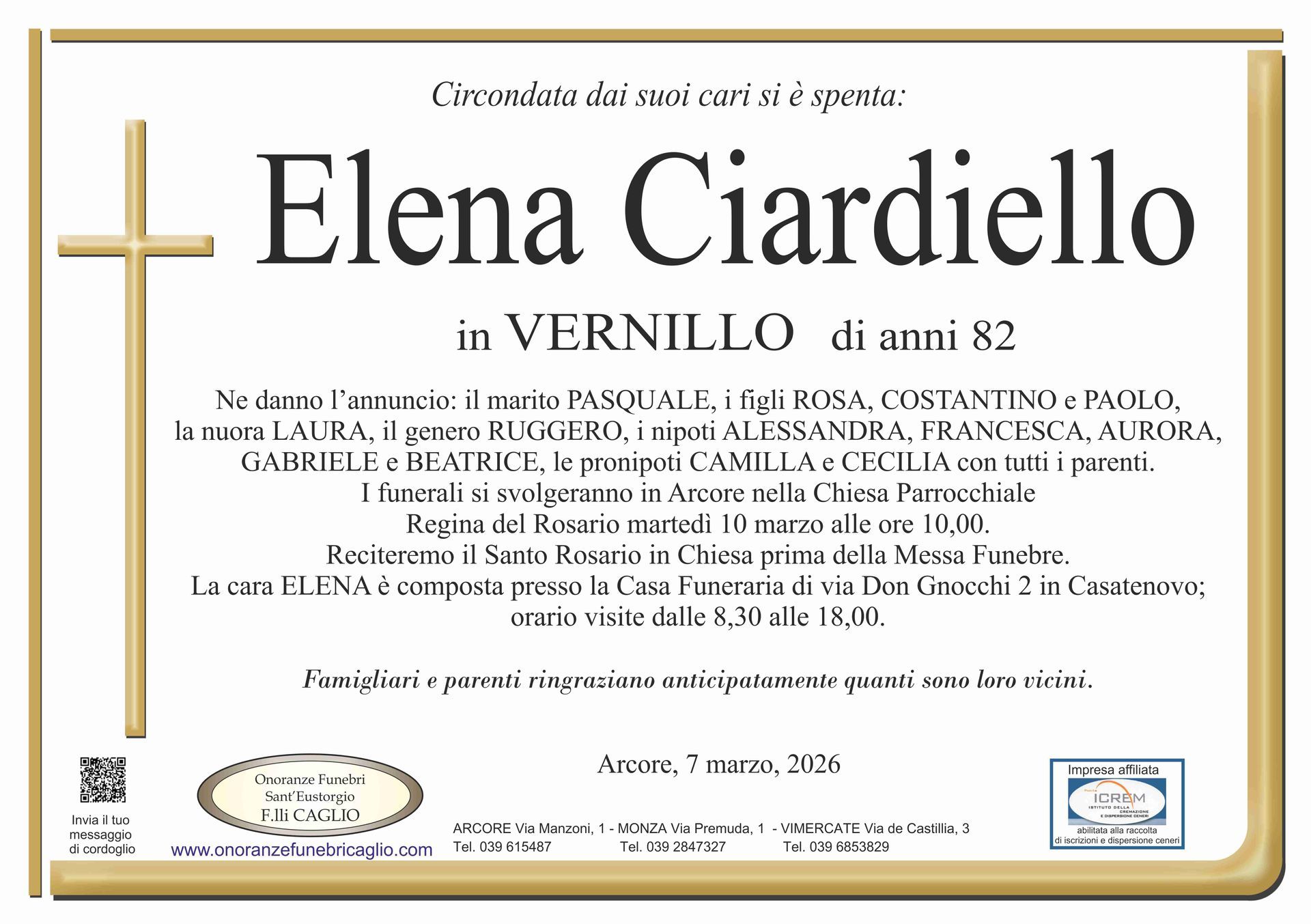 Nel doloroso momento del lutto riconosciamo quanto sia importante poter offrire un conforto, anche quando non è possibile essere fisicamente presenti. Per questo motivo, abbiamo implementato in questa sezione dedicata agli annunci funebri la possibilità di inviare un messaggio di condoglianze alla famiglia del defunto tramite il nostro sito.