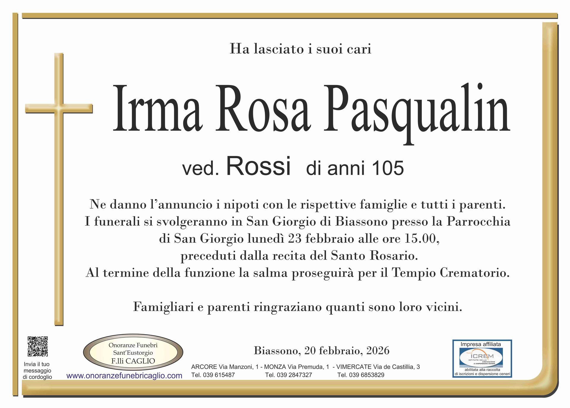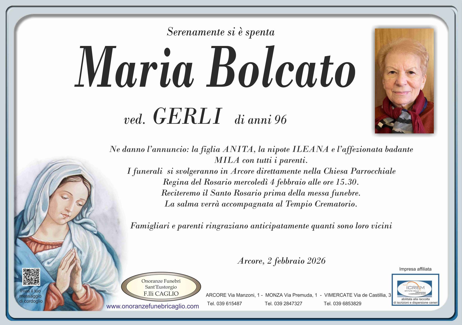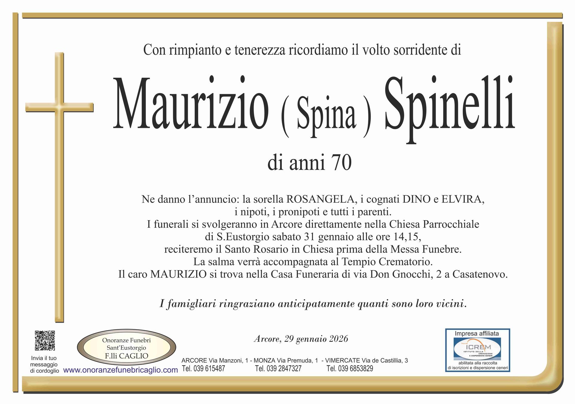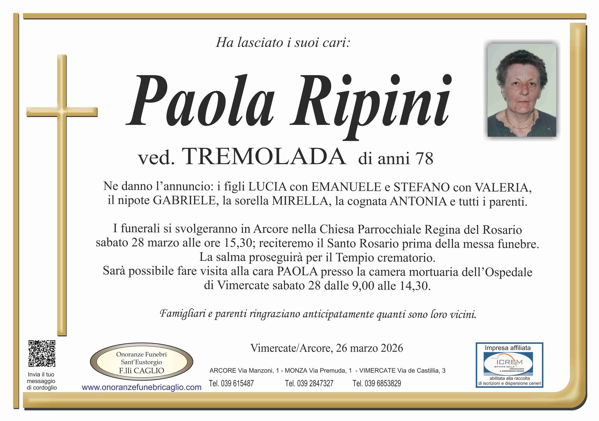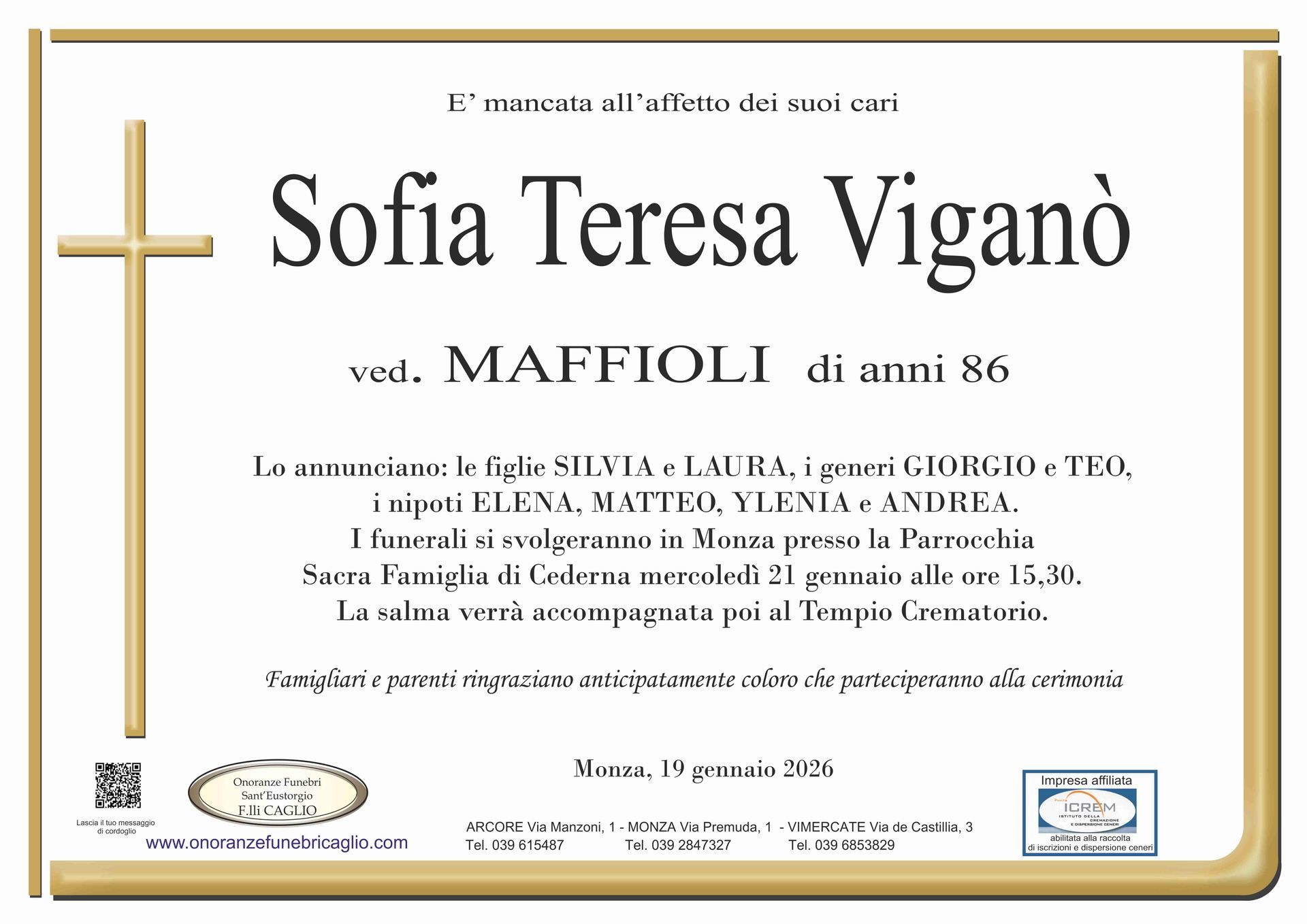 Nel doloroso momento del lutto riconosciamo quanto sia importante poter offrire un conforto, anche quando non è possibile essere fisicamente presenti. Per questo motivo, abbiamo implementato in questa sezione dedicata agli annunci funebri la possibilità di inviare un messaggio di condoglianze alla famiglia del defunto tramite il nostro sito.