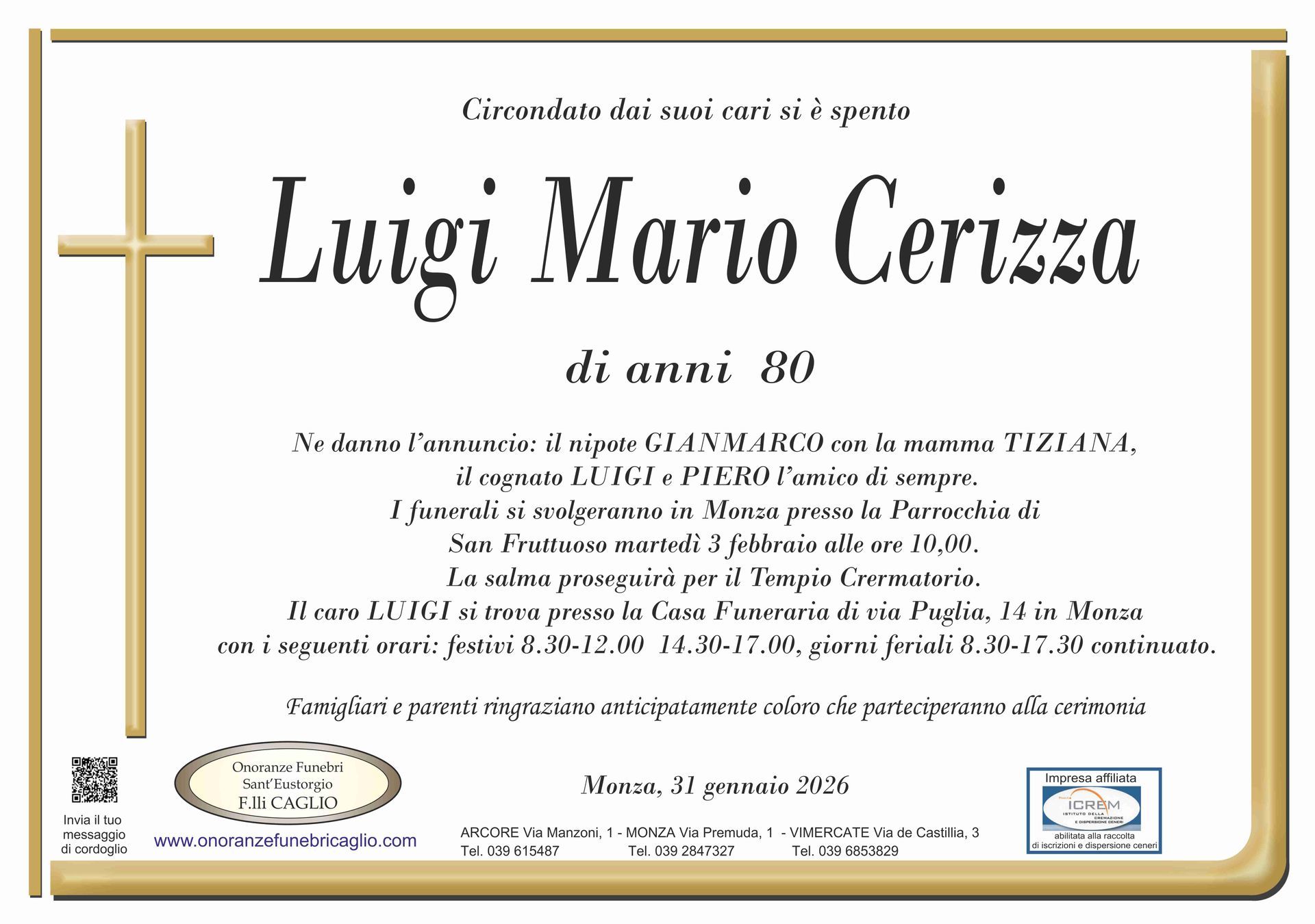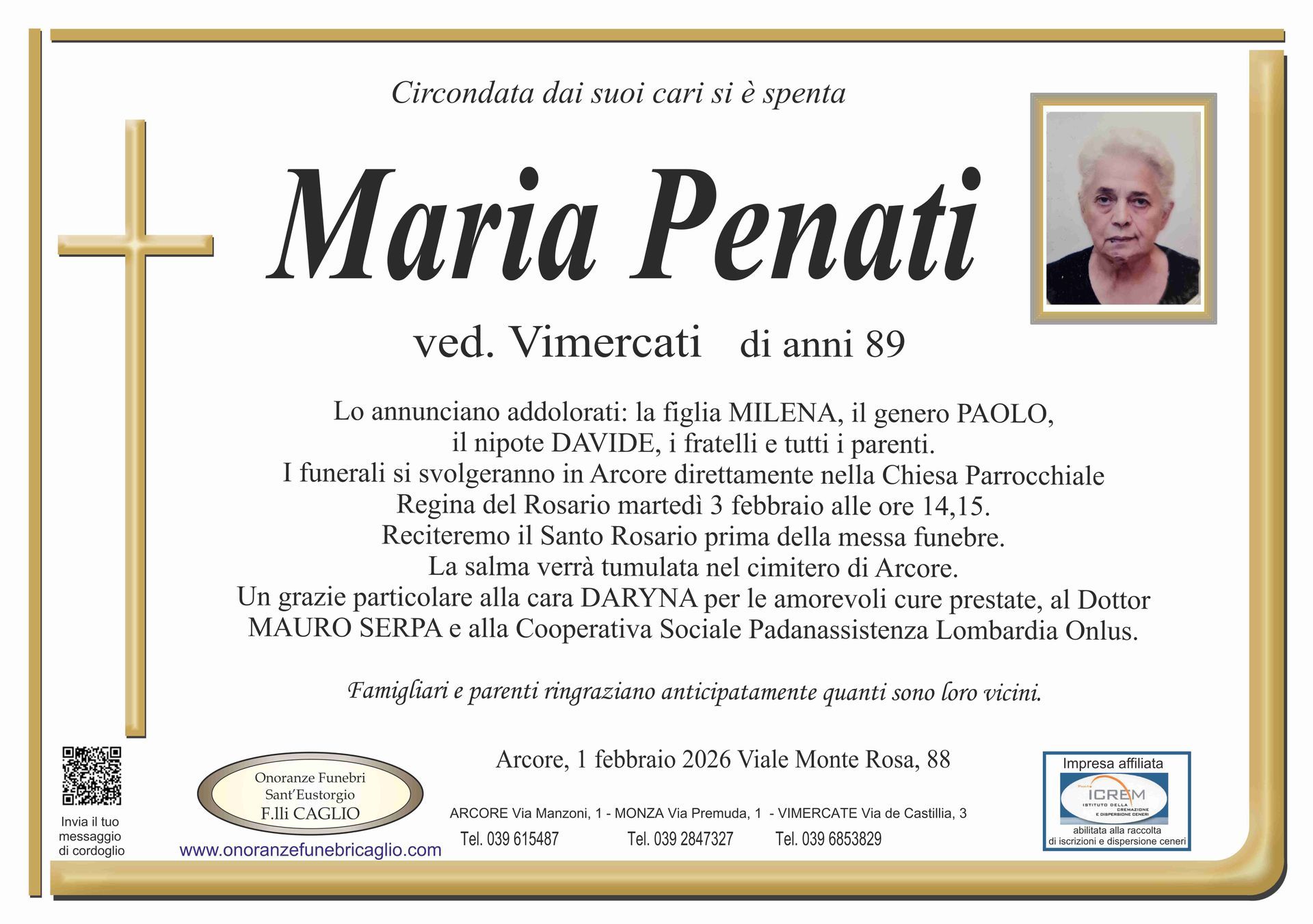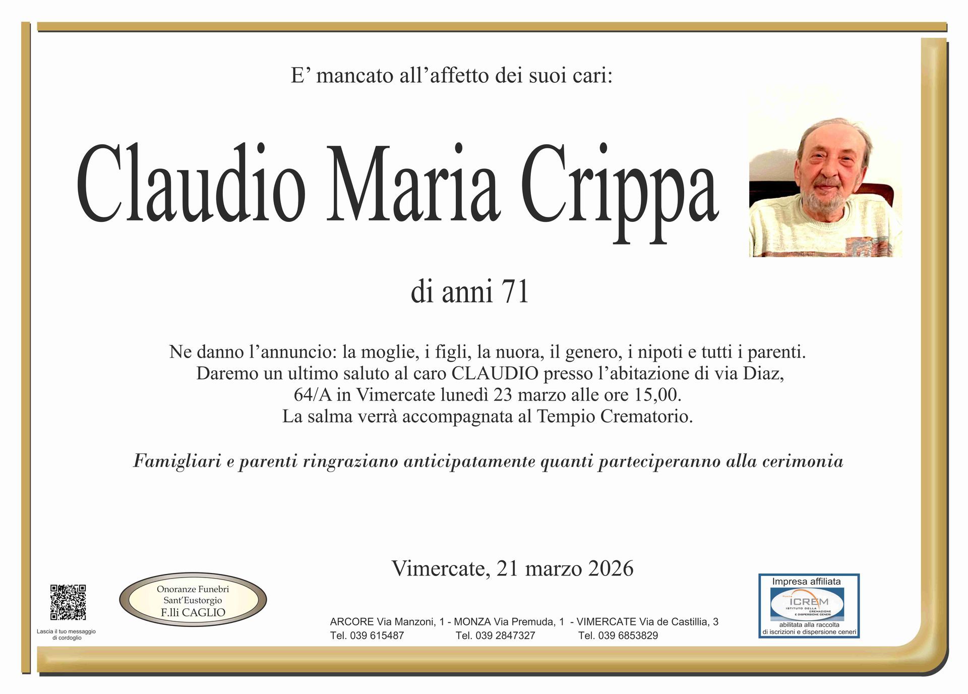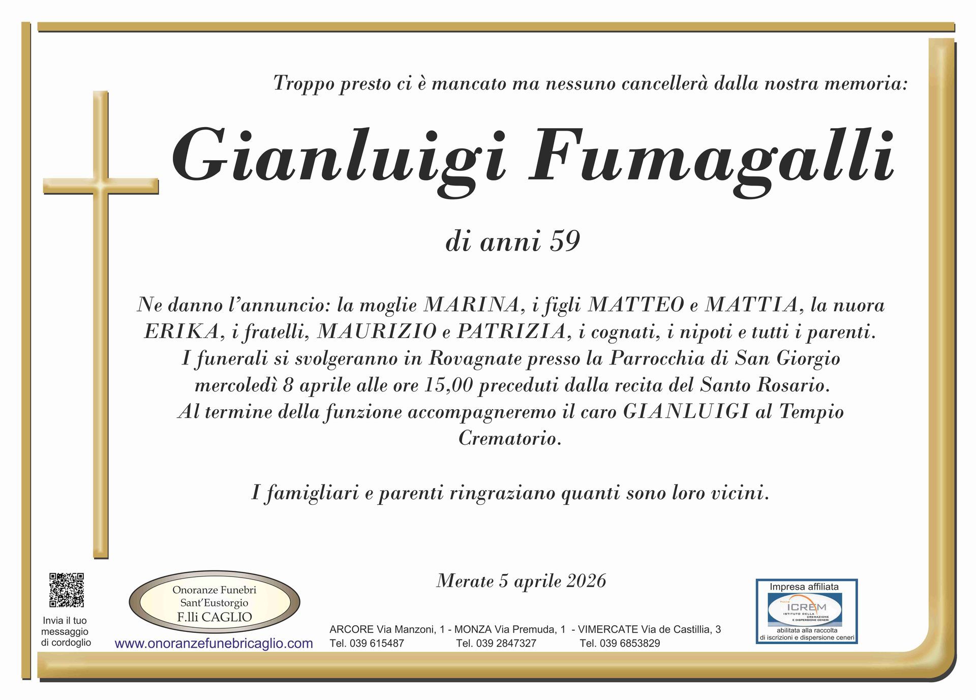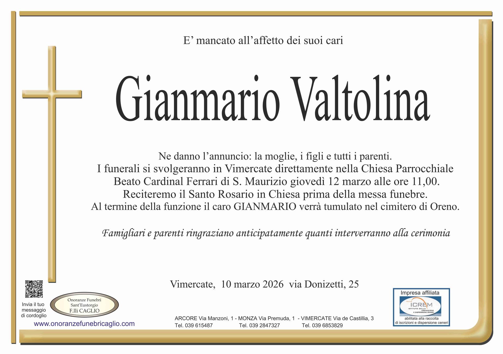 Nel doloroso momento del lutto riconosciamo quanto sia importante poter offrire un conforto, anche quando non è possibile essere fisicamente presenti. Per questo motivo, abbiamo implementato in questa sezione dedicata agli annunci funebri la possibilità di inviare un messaggio di condoglianze alla famiglia del defunto tramite il nostro sito.